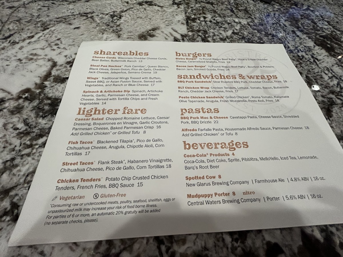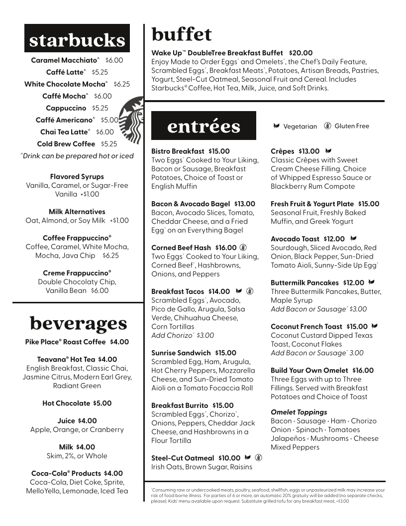 Enjoy the Chef’s Daily Feature, Scrambled Eggs, Made to Order Eggs and Omelets, Breakfast Meats, Seasoned Potatoes, Artisan Breads, Local Pastries, Assorted Yogurt, Steel-Cut Oatmeal, Seasonal Fruit, Cereals, and Essential Beverages Including Starbucks® Coffee, Milk, Juice, and Soda.